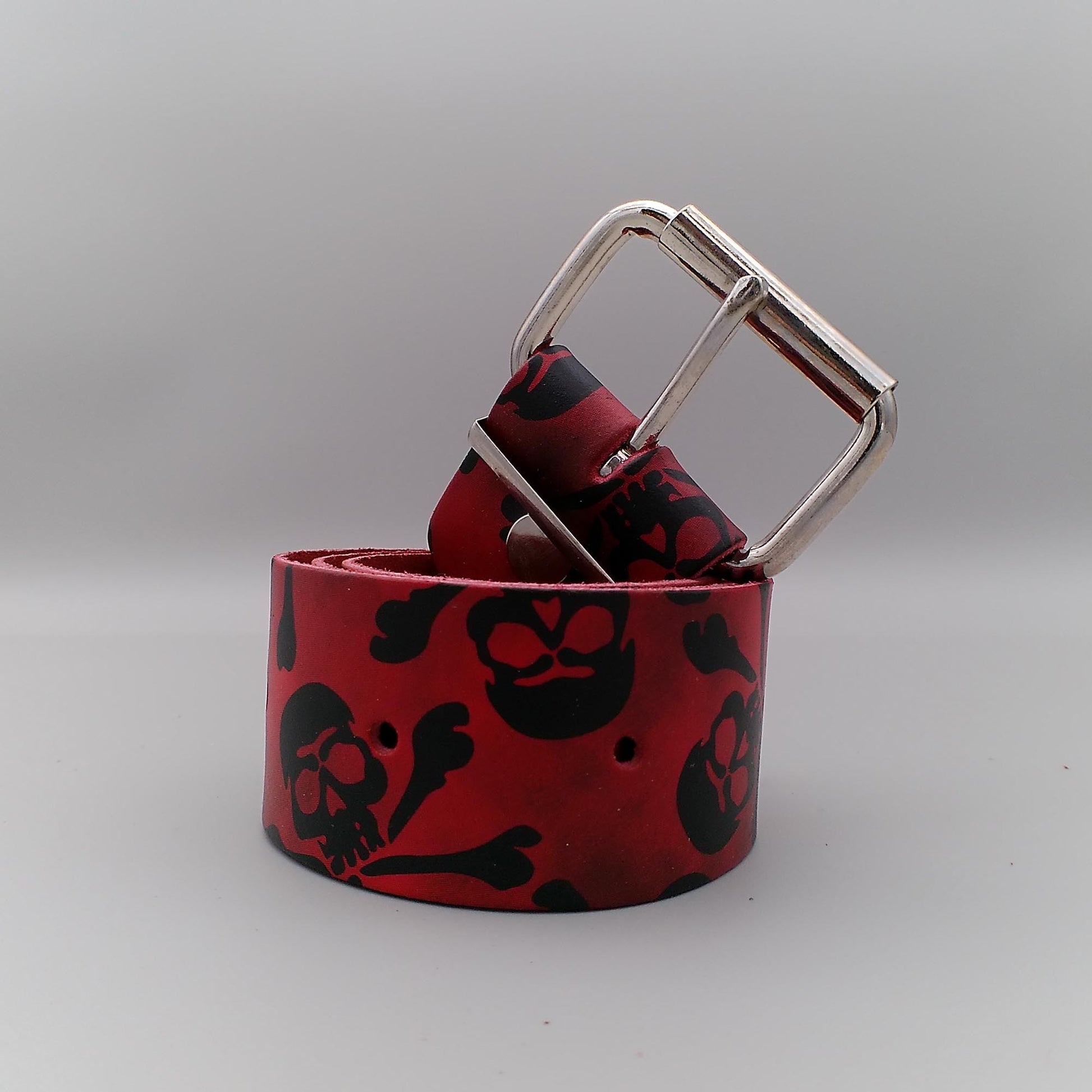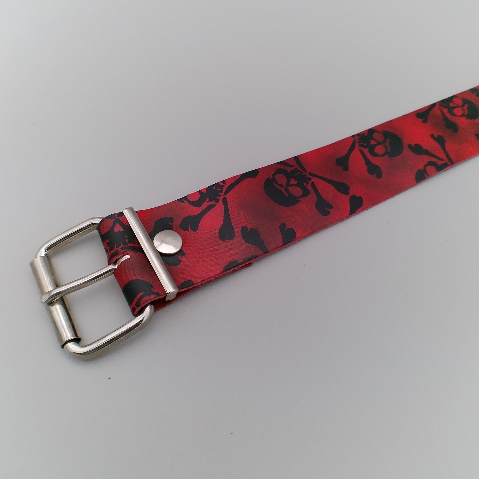 A red belt with black skulls on red handmade of genuine leather